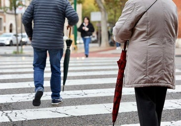 Viandantes se protegen de la lluvia en Ávila capital este jueves. EFE/Raúl Sanchidrián