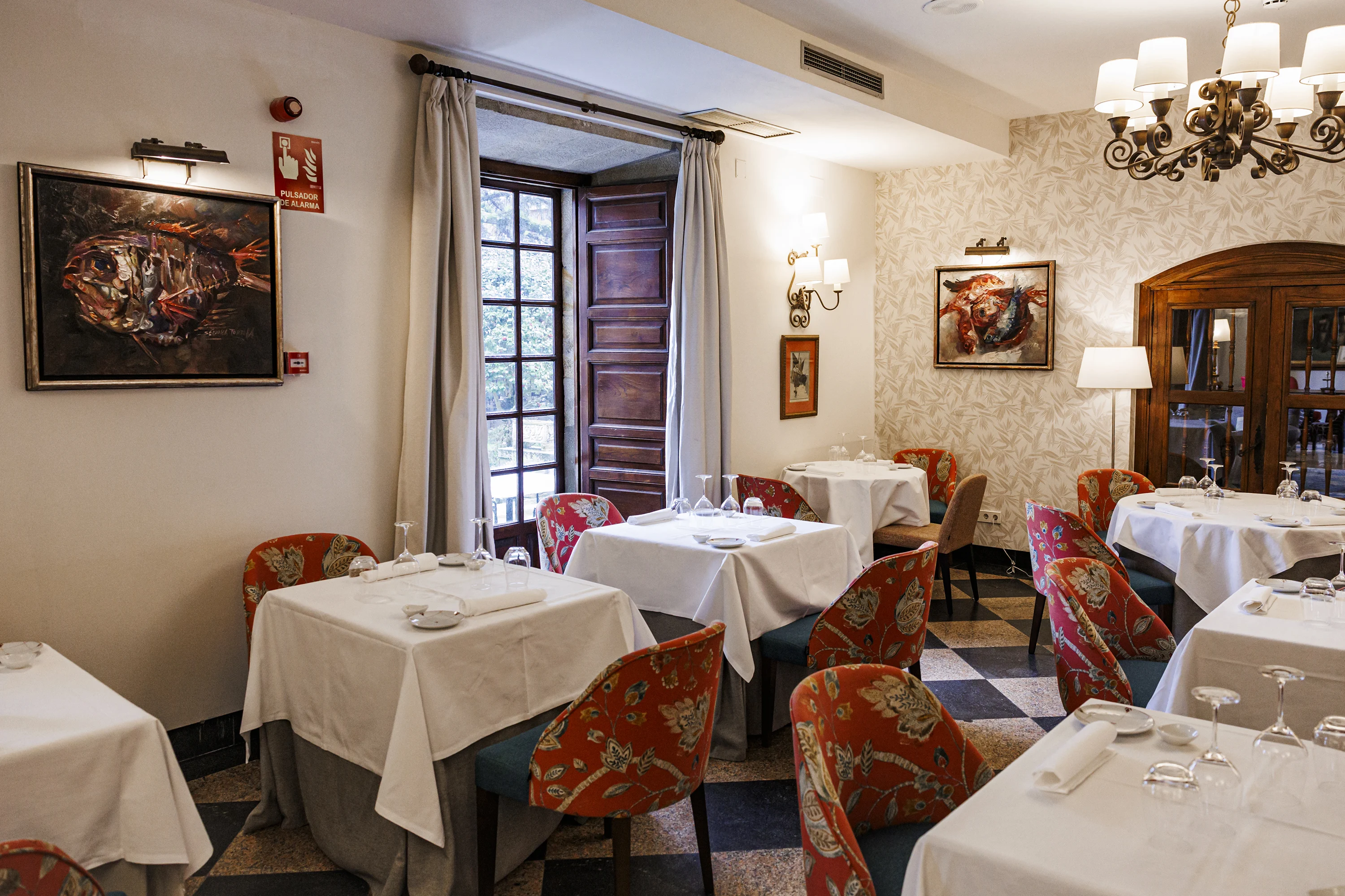 Este chef auriense ha recorrido diversos Paradores y ofrece, con éxito, una de las cocinas más refinadas que podemos encontrar. Cuenta que su objetivo es “unir la tradición que se espera de este alojamiento con la modernidad que añade matices a lo clásico”. Formado en la Escuela de Hostelería de Santiago, Alberto González plantea una carta eminentemente marítima (cómo no) que respira aire gallego. Su sopa de pescado, por ejemplo, se presenta con un tartar de mejillón. La suavidad del caldo se intensifica cuando el tartar empieza a deshacerse para integrarse. Una de sus obras maestras es la corvina: una costra de cerdo triturado, con tempura, y un paso por la freidora a 200 grados; se presenta sobra una cama de arroz negro falso (el redactor guardará el secreto) y con emulsiones de azafrán y esferificación de limón. ¿El resultado? Un plato verdaderamente atrevido y equilibrado. “Tenemos que reconocer que es de los platos que más funcionan”. El taco de atún, en cambio, se mueve en un terreno, quizá, más suave, sorprendentemente. Se presenta con berenjena escabechada, un poco de ajo, laurel y vinagre y un wasabi rebajado; de ahí la sorpresa. “Nuestro buque insignia es tradición e historia, pero yo siempre planteo una pincelada o detallito más vanguardista”, explica este cocinero. La otra perla marina que hay que contar es el salmón ahumado, que se macera en jengibre, soja y aceite; y se presenta sobre una pequeña cama de calabaza. Se ahuma a la vista del cliente, por lo que verlo y degustarlo es un espectáculo.