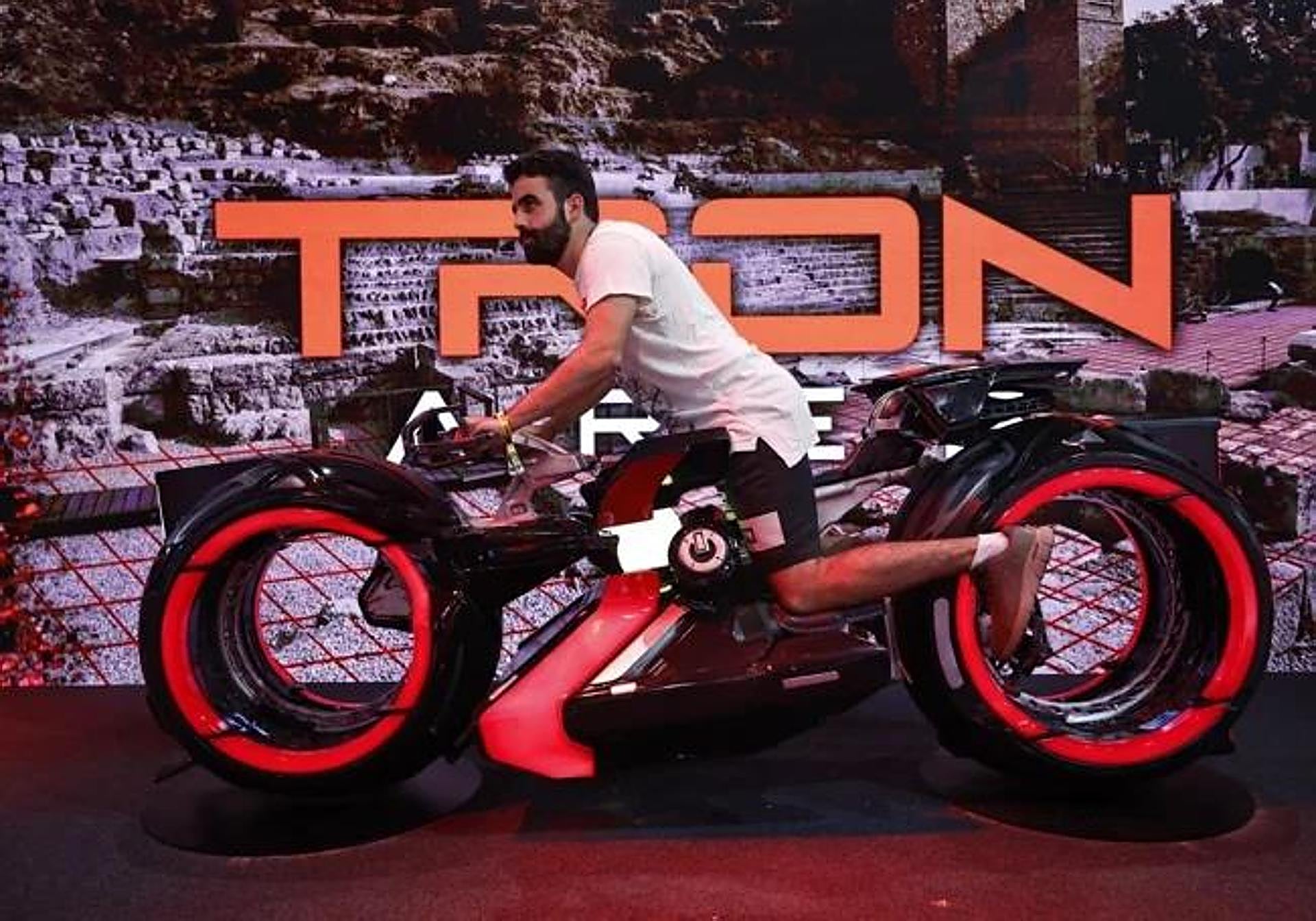 Hombre posa en la motocicleta de Tron. Salvador Salas