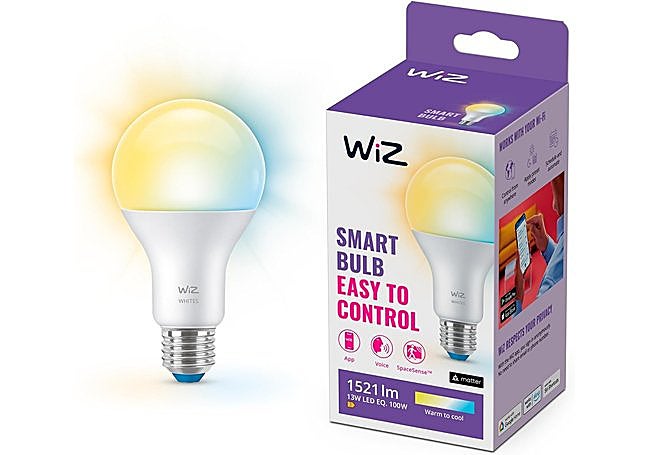 Con tecnología SpaceSense, la bombilla inteligente WiZ A67 de 13W ofrece control de luz blanca y de colores desde el móvil o por voz. Su alta luminosidad de 1521 lúmenes y la detección de movimiento permiten automatizar la iluminación, mientras la compatibilidad con Alexa y Google Home facilita la gestión diaria de ambientes personalizados sin instalaciones adicionales.