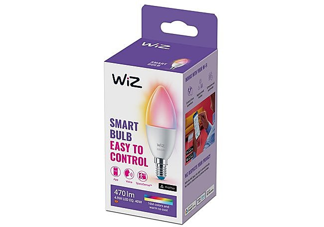 La bombilla LED inteligente WiZ E14 tiene formato tipo vela y tecnología SpaceSense. Permite controlar colores y tonos blancos desde la app o por voz. Cuenta con conexión Wi-Fi para gestión remota y detección de movimiento para automatizar la iluminación. Consume 4,9W.
