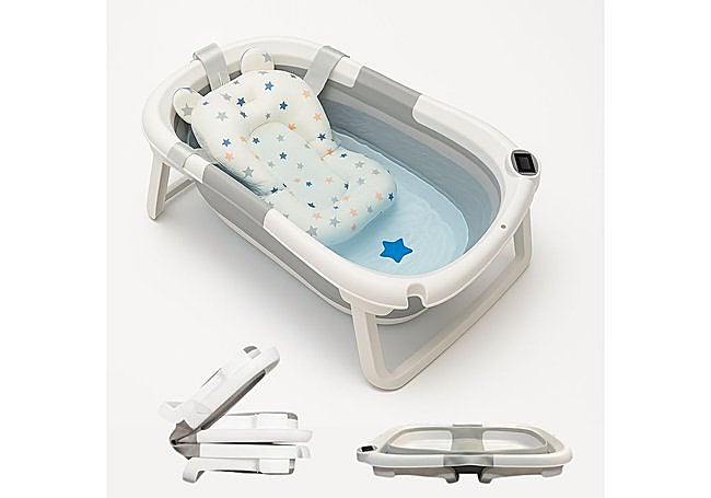 Ahorra espacio y gana tranquilidad con esta bañera plegable para bebé con termómetro y cojín seguro