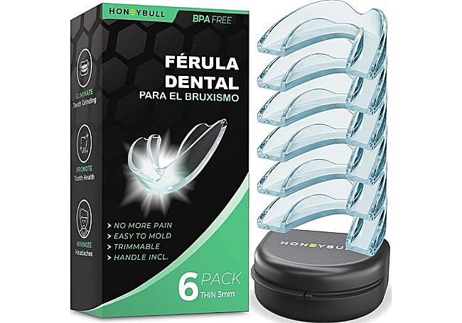 HONEYBULL ofrece un pack de seis protectores bucales finos, moldeables y recortables para adultos. El formato delgado está pensado para quienes sufren bruxismo leve y desean dormir con comodidad, sin sensación aparatosa ni molestias al hablar.