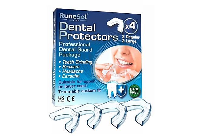 Runesol presenta un pack de cuatro férulas dentales en varios tamaños, diseñadas para adultos. Fabricadas con resina de copolímero libre de BPA, estas férulas destacan por su resistencia y facilidad de moldeado, adaptándose cómodamente a la dentadura para reducir el desgaste causado por el bruxismo.