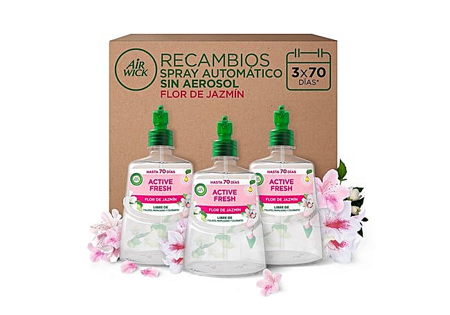 Air Wick Active Fresh Spray Automático Sin Aerosol transforma tu hogar con un delicado aroma a flor de jazmín, creando un ambiente fresco y acogedor durante semanas. Su innovador sistema sin aerosol libera fragancia de forma continua y permite ajustar la intensidad según tus necesidades, gracias al control de intensidad y el botón boost.
