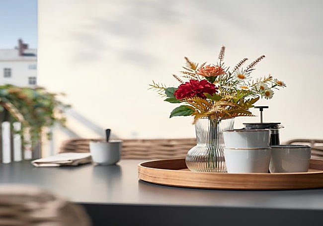 Para combinar el jarrón, te propongo este ramo artificial con flores de colores otoñales, fabricado con un 50% de plástico reciclado. Te va a costar sólo 4,99€ y será el punto de color exacto que necesitas para tu rincón cozy.