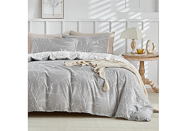 Gracias a su diseño reversible, la funda nórdica Tokokimo de microfibra presenta un estampado botánico en gris y blanco que aporta frescura visual al dormitorio. Incorpora cremallera oculta y lazos en las esquinas para una fijación sencilla y segura. El tejido ultrasuave, ligero y transpirable facilita el mantenimiento y contribuye a un descanso confortable durante todo el año.