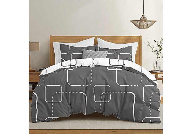 El set de Amazon Basics en microfibra tiene una textura ultrasuave y un diseño de rayas gris oscuro. Incluye cierre de broches y lazos internos para mantener el edredón en su lugar. Es lavable a máquina y presenta resistencia a las arrugas y al encogimiento. Cuenta con certificación Oeko-Tex, que garantiza la seguridad y el respeto ambiental en los textiles.