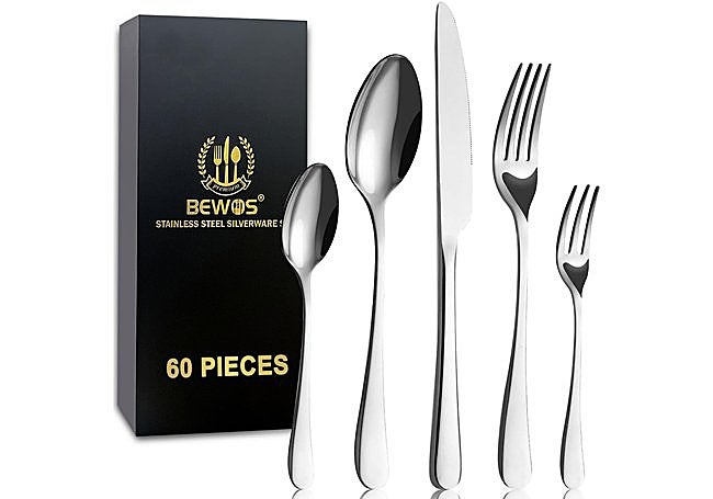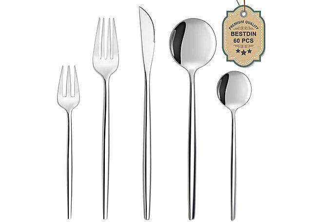 Con un estilo minimalista que apuesta por la elegancia, el juego de cubiertos Bestdin para 12 personas suma 60 piezas de acero inoxidable con acabado resistente al óxido. El diseño incluye cuchillos, tenedores, cucharas y tenedores de postre, todos con mangos delgados y cabezas redondeadas que aportan personalidad y distinción a la mesa.