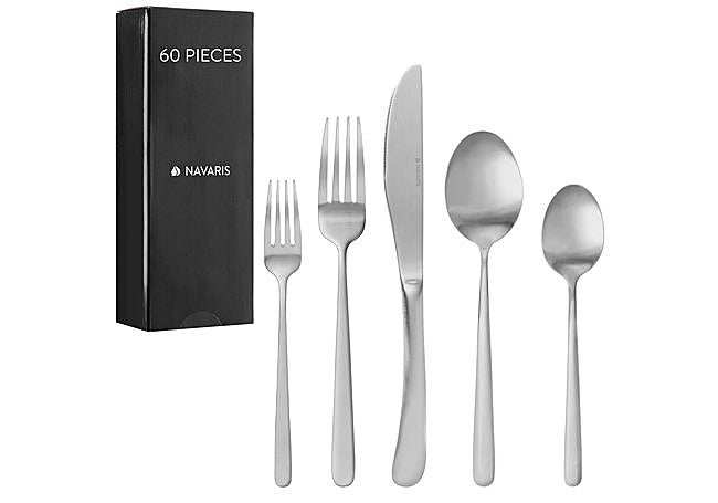 Gracias a su acabado mate satinado, este set de cubiertos Navaris para 12 personas aporta un toque discreto y moderno a cualquier mesa. Con 60 piezas fabricadas en acero inoxidable 18/0, la cubertería incluye cuchillos, tenedores, cucharas y utensilios para postre, todos diseñados para resistir el uso diario sin perder su atractivo visual.