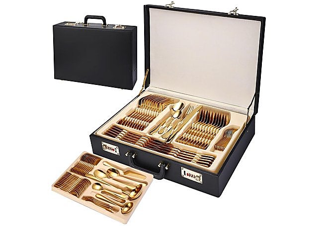 Con un acabado dorado sofisticado, este juego de cubertería YJKKZQLB para 12 personas se presenta en una elegante caja de almacenamiento. Incluye entre 72 y 84 piezas fabricadas en acero inoxidable 18/10, resistentes y pensadas para destacar en cualquier mesa. El estuche de cuero con cerradura facilita el transporte y protege cada cubierto.