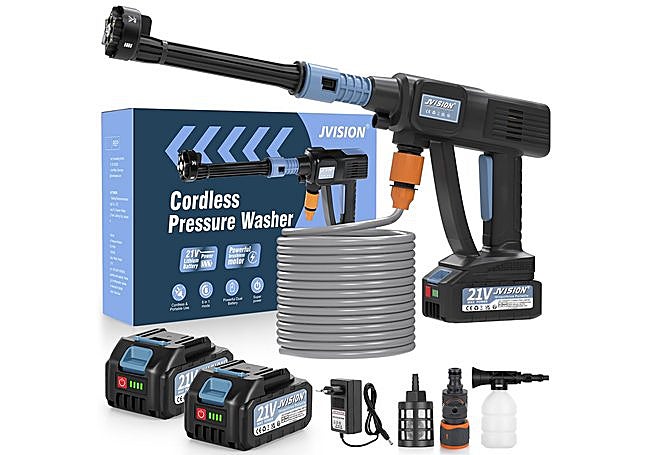 Gracias a su diseño portátil, la hidrolimpiadora de batería JVISION permite limpiar el coche, la terraza o cualquier rincón exterior sin depender de enchufes. Su boquilla 6 en 1 ofrece diferentes tipos de chorro para adaptarse a cada superficie, mientras que las dos baterías incluidas garantizan hasta 70 minutos de autonomía, ideal para limpiezas prolongadas. El depósito de espuma facilita el lavado en profundidad y la manguera de cinco metros con filtro permite usar agua de cubos o depósitos.