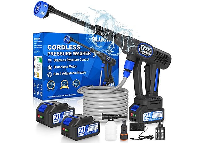 Con un motor sin escobillas y dos baterías de 4.0 Ah, esta hidrolimpiadora de Blucky ofrece limpieza inalámbrica y potente en cualquier rincón del hogar o el coche.