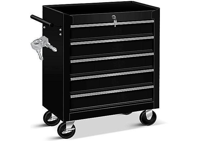 Con una estructura de acero resistente y un diseño compacto, ofrece varios compartimentos para el almacenamiento eficiente de herramientas. La encimera soporta el uso diario, y los cajones extraíbles con revestimiento antideslizante mantienen las herramientas seguras. Mover el carro es sencillo gracias a sus ruedas giratorias y fijas con freno. Además, su sistema de cierre aporta seguridad y la barra de agarre facilita el transporte.