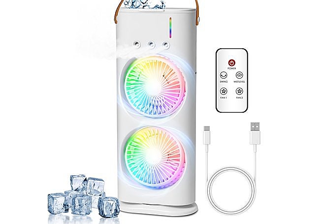 El doble ventilador y el depósito de 600 ml aseguran un flujo de aire potente y prolongado, mientras que la función de humidificación alivia la sequedad ambiental. La luz ambiental de siete colores y el control remoto añaden comodidad y personalización.