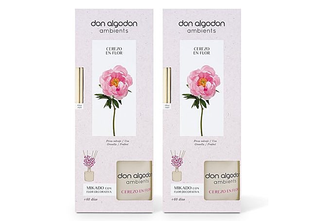 Este difusor de varillas Don Algodon Ambients Flor de Cerezo ofrece una fragancia envolvente gracias a sus extractos naturales y varillas de ratán, que liberan el aroma de manera progresiva. El formato doble de 60 ml asegura más de 60 días de uso, manteniendo la estancia perfumada durante semanas.