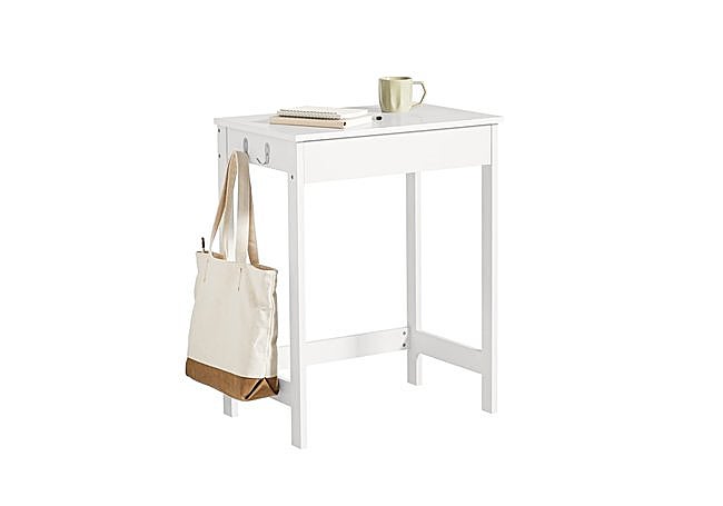 Como escritorio para home office o mueble funcional para estudio, destaca por su cajón deslizante y dos ganchos laterales, que ofrecen soluciones prácticas para mantener ordenados documentos y accesorios.
