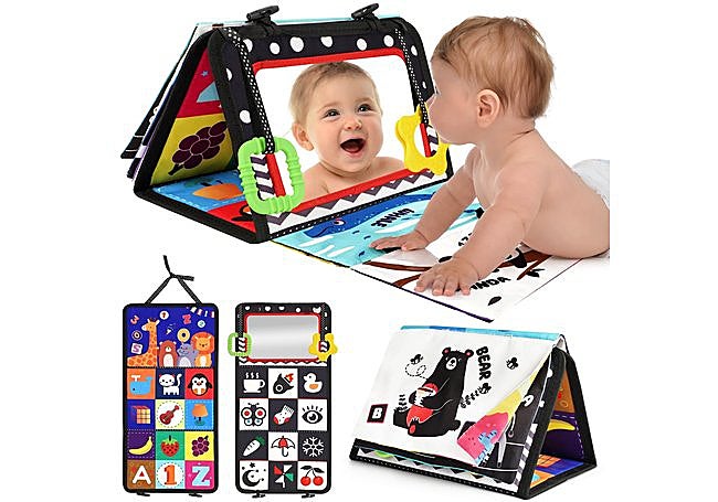 En formato plegable y ligero, este libro sensorial de tela de URMYWO combina patrones de alto contraste y colores vivos que captan la atención de los bebés desde los primeros meses. Su estructura incluye páginas con papel crujiente, un espejo seguro y mordedores sin BPA, todo pensado para estimular el desarrollo visual y sensorial.
