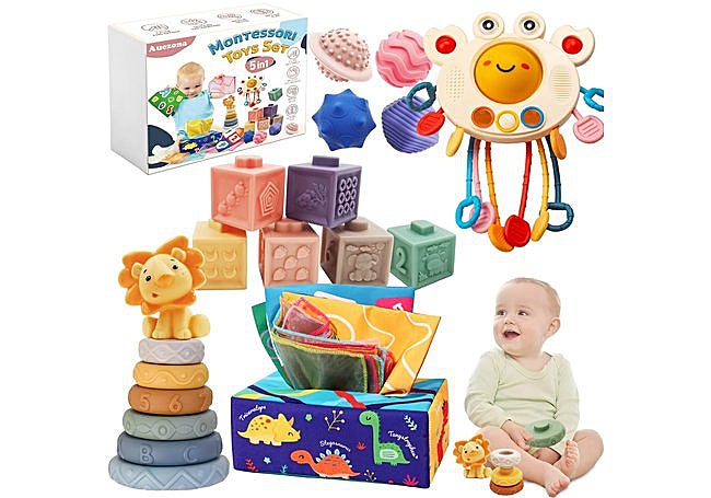 Con una propuesta multifuncional, este set Montessori 5 en 1 de Auezona reúne bloques apilables, pelotas sensoriales, anillos y una caja de pañuelos en un solo paquete. Fabricado en silicona y ABS sin BPA, el conjunto está pensado para acompañar el desarrollo desde los seis meses, permitiendo que los pequeños exploren texturas y colores de manera segura.