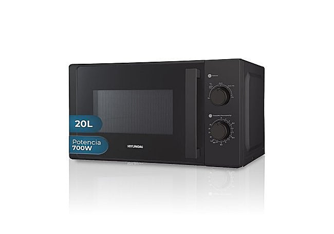 Con una estética moderna y puerta de cristal negro, el microondas Hyundai HMW2700N ofrece 20 litros de capacidad y 700 W de potencia en un formato compacto. Los controles manuales y el temporizador mecánico de hasta 35 minutos permiten un manejo sencillo y preciso, adaptándose fácilmente a cocinas pequeñas o caravanas.