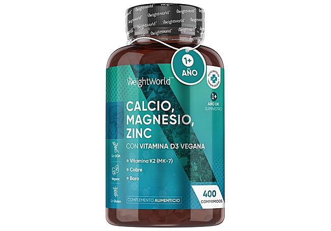 Con una fórmula vegana y sin OGM, este suplemento de WeightWorld combina calcio, magnesio, zinc, vitamina D3, K2 (MK-7), cobre y boro en 400 comprimidos pensados para más de un año de uso. El formato comprimido facilita la incorporación diaria sin complicaciones y es apto para personas con dietas sin gluten.
