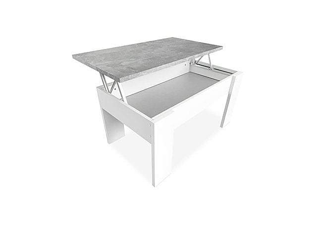 Elaborada en madera aglomerada resistente, la mesa de centro elevable de DUÉRMETE ONLINE presenta un acabado blanco con tapa gris cemento y líneas escandinavas. Su mecanismo permite ajustar la altura fácilmente gracias a guías metálicas, y el compartimento interior facilita el almacenaje. La superficie es impermeable y de fácil limpieza, aportando durabilidad y practicidad al salón.