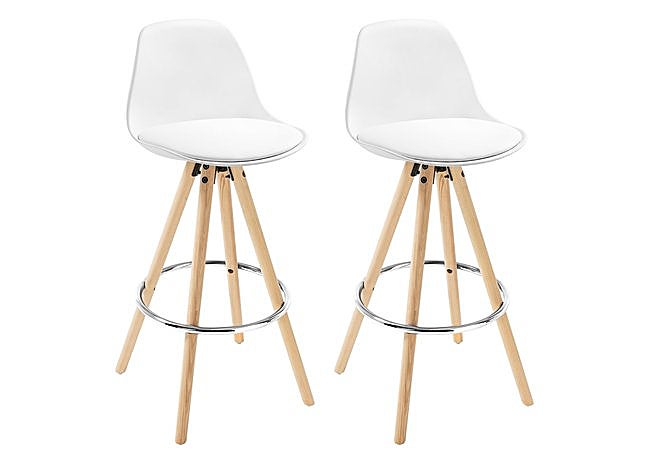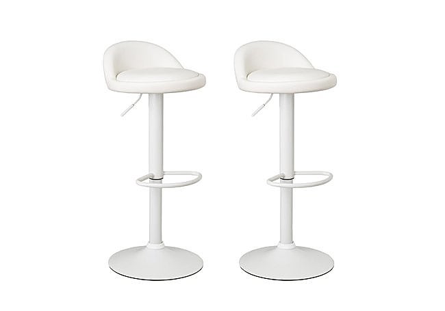 Si buscas un asiento versátil que se adapte a distintos ambientes, este juego de taburetes altos DUMOS en blanco combina diseño moderno y funcionalidad. La estructura metálica y el asiento tapizado en cuero sintético ofrecen resistencia y un toque elegante, mientras que la altura ajustable de 60 a 80 cm permite adaptar cada taburete a la barra o mesa que prefieras.