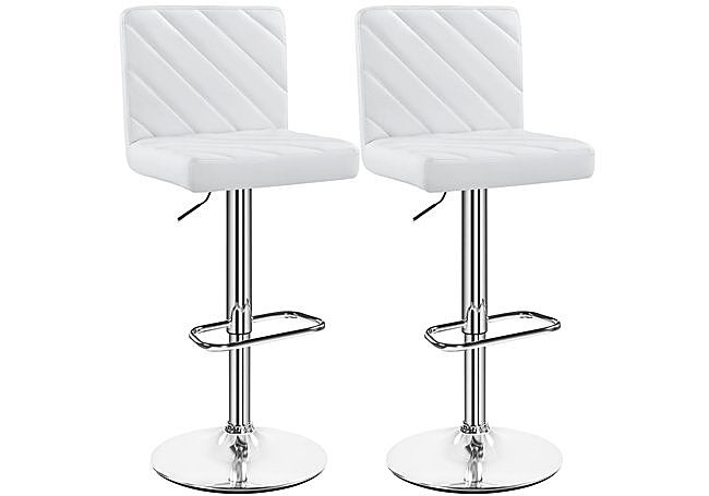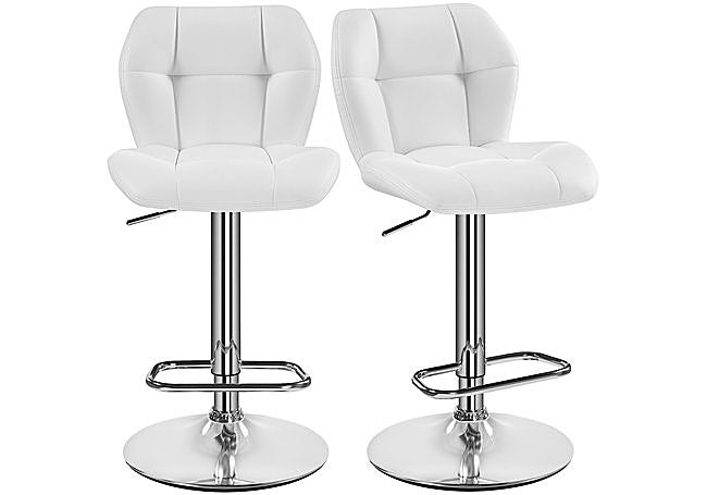 Con estructura metálica robusta y tapizado blanco en polipiel, este juego de taburetes altos Yaheetech destaca por su altura regulable de 89 a 111 cm. El asiento y respaldo acolchados con espuma densa aportan una comodidad notable, mientras que el acabado en metal añade un toque moderno y resistente a cualquier barra de cocina o comedor.