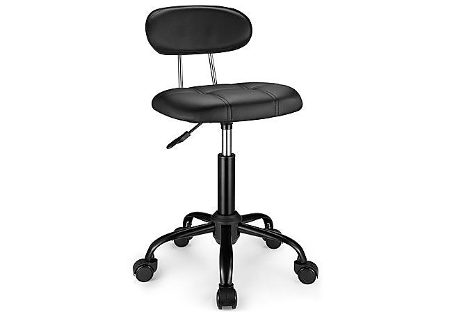 El taburete cuadrado de FNZIR con respaldo, en elegante negro, presenta altura regulable y función giratoria de 360°, lo que facilita adaptarse a distintas superficies y necesidades. El asiento acolchado en piel sintética proporciona una sensación agradable y moderna, mientras que las ruedas permiten moverlo cómodamente sin esfuerzo.