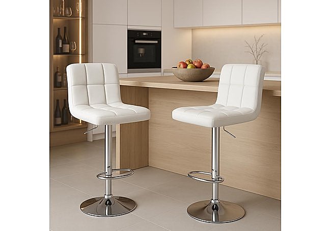 El set de taburetes altos LOLAhome, en blanco, ofrece asiento giratorio de 360° y altura regulable entre 72 y 92 cm. Su tapizado en polipiel suave y estructura metálica garantizan durabilidad y un acabado elegante que combina con cualquier barra o isla.