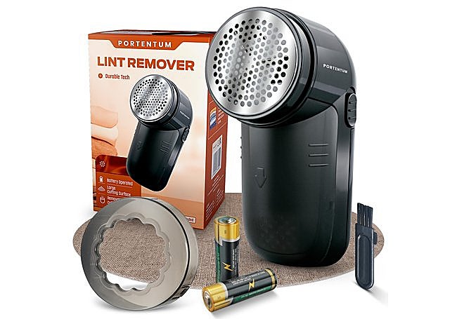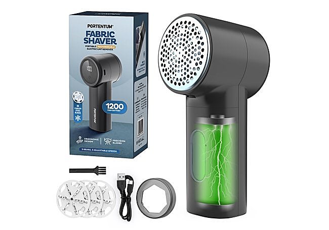 Con cuchillas de acero inoxidable y cabezal de gran tamaño, el quitapelusas eléctrico PORTENTUM elimina bolitas y pelusas de forma rápida en todo tipo de tejidos. El depósito desmontable facilita la limpieza tras cada uso. Incluye pilas y un cepillo de mantenimiento, ofreciendo un funcionamiento cómodo y eficiente en un formato compacto y ligero.
