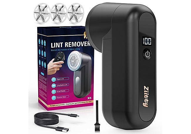 Equipado con pantalla LCD, el quitapelusas eléctrico Ziitty muestra el nivel de batería y velocidad de funcionamiento. Incorpora seis cuchillas de acero y ajuste de dos velocidades, lo que permite eliminar pelusas de forma eficaz en distintos tejidos. Su batería recargable por USB tipo C y sistema de bloqueo de seguridad añaden comodidad y protección en cada uso.