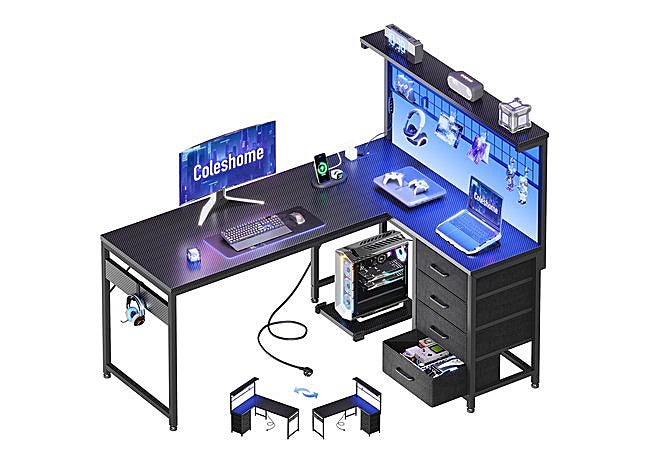 ¿Te gustaría un escritorio que combine orden y tecnología? El modelo gaming de Coleshome destaca por su diseño en L reversible, adaptándose a cualquier rincón y permitiendo elegir la orientación según el espacio. Con una superficie de 130 x 100 cm, incorpora estantes, cuatro cajones y fibra de carbono negra que aporta un toque moderno.