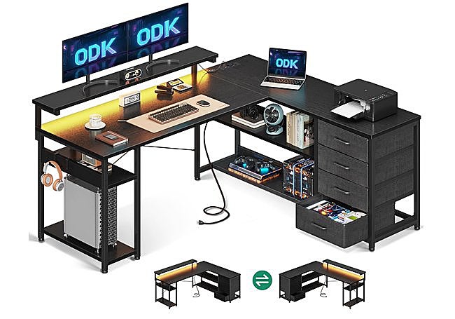 Gracias a su formato esquinero en L, este escritorio ODK negro de 135×110 cm aprovecha cualquier rincón y se adapta tanto a espacios de trabajo como de gaming. Incorpora cuatro cajones, estantes abiertos y soporte para monitor, ofreciendo organización eficiente y un entorno ordenado. El diseño reversible permite ajustar la disposición según la habitación.