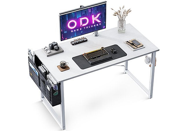 Gracias a su diseño compacto, el escritorio ODK en color blanco encaja en espacios pequeños sin renunciar a una superficie de trabajo amplia. Su estructura metálica y tablero resistente a los arañazos garantizan durabilidad y fácil limpieza, mientras que la bolsa lateral y el gancho para auriculares ofrecen organización extra sin ocupar espacio adicional.