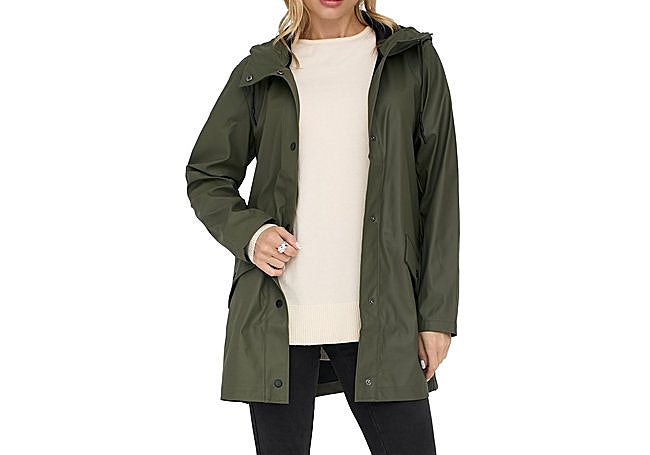 Presenta una silueta de tres cuartos que cubre más área contra la lluvia y el viento. Incorpora tecnología impermeable y transpirable, junto con un forro interior suave. El diseño está adaptado a la morfología femenina y utiliza materiales seleccionados por su resistencia y ligereza, en una prenda funcional.