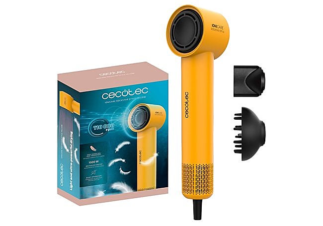 Gracias a su diseño compacto y ligero, el secador de pelo Cecotec Rockstar Style Yellow resulta cómodo de manejar y fácil de transportar. Su motor brushless de 1500 W alcanza 110.000 rpm, lo que garantiza un secado rápido sin renunciar a la suavidad y el brillo natural del cabello. El generador de iones combate el encrespamiento y mantiene la hidratación.