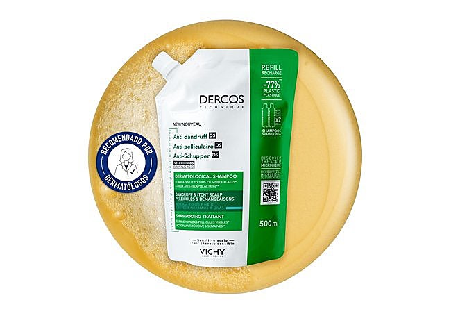 El champú Vichy Anticaspa para cabellos grasos contiene tecnología DS Selenium Microbiome diseñada para reducir la caspa visible y el picor del cuero cabelludo. Su fórmula ofrece limpieza profunda y acción antirrecurrente durante hasta seis semanas, manteniendo el cuero cabelludo limpio y sin residuos.