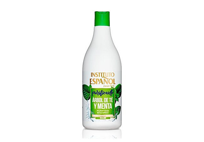 Instituto Español champú líquido contiene árbol de té, menta, argán y keratina. Está formulado para limpiar el cuero cabelludo y reestructurar el cabello seco o dañado. Su fórmula purificante equilibra el exceso de grasa y ayuda a prevenir la caspa.