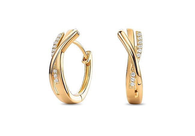 Pendientes de aro cruzado en plata de ley 925 con baño de oro amarillo de 18K. Incluyen nueve circonitas transparentes. Su estructura es hipoalergénica, adecuada para pieles sensibles. El acabado pulido proporciona un reflejo de luz uniforme y un diseño cuidado.