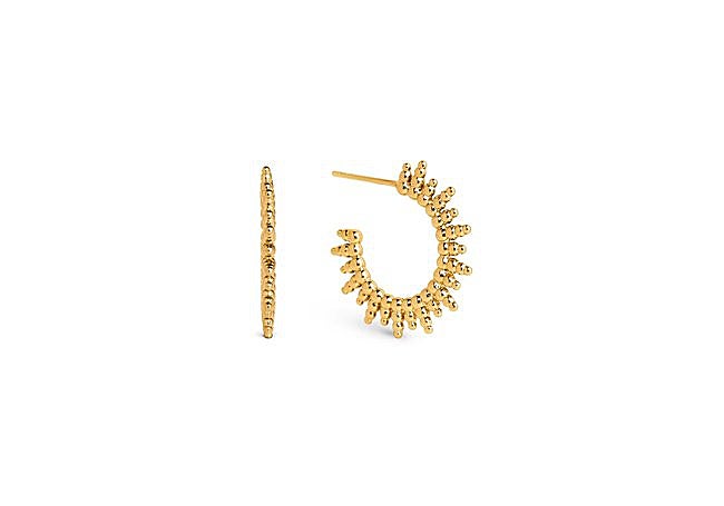 Los pendientes Pebbles Sun de SINGULARU tienen un diseño inspirado en la silueta del sol, con un aro de latón bañado en oro de 18 quilates y bolitas decorativas. Cuentan con un cierre de tuerca a presión y se entregan con estuche.