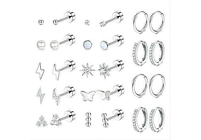 Conjunto de pendientes de acero inoxidable Morfetto con superficie pulida y acabado resistente al agua. Incluye 14 pares entre studs y aros pequeños, todos hipoalergénicos y ligeros, pensados para oídos sensibles. El diseño moderno y los tonos neutros permiten combinar estilos fácilmente, mientras que la presentación en caja añade un toque elegante y práctico.