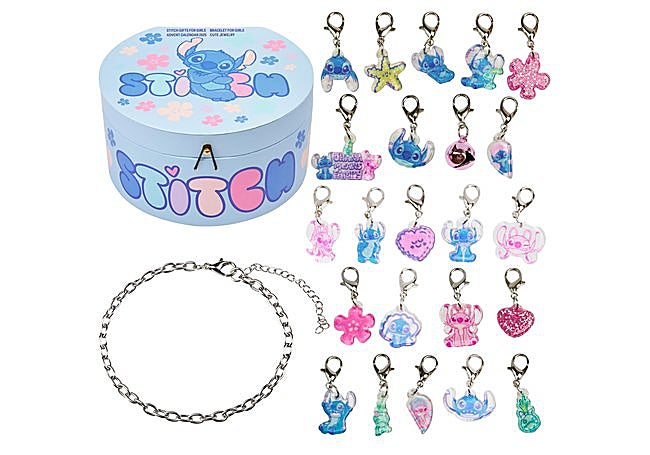 Con un diseño temático de Disney Stitch, este calendario de adviento presenta una pulsera plateada acompañada de 23 charms distintos. Cada compartimento revela una pieza decorativa que permite personalizar la pulsera, ofreciendo variedad y colorido.