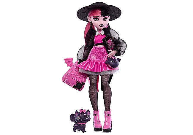 La muñeca Draculaura de Monster High es una muñeca articulada en tonos rosas y negros que permite crear posturas dinámicas. Incluye accesorios como su mascota Count Fabulous, un libro de hechizos, una mochila temática y brillo de labios. Su vestuario de estilo vampírico y los elementos incluidos facilitan el juego imaginativo y la creación de historias.