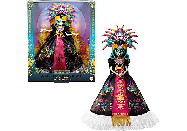 Con detalles inspirados en la tradición azteca, la muñeca coleccionable Skelita Calaveras de Monster High destaca por su vestido negro decorado con coloridos símbolos y un tocado de plumas llamativo. El conjunto incluye collar y cinturón, rindiendo homenaje al Día de Muertos con acabados detallados que reflejan la herencia cultural y el carácter festivo del diseño.