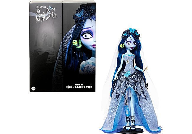 Con un vestido de novia gótico confeccionado en tela de telaraña sobre tul azul, la muñeca Monster High Skullector Emily destaca por detalles únicos como el velo decorado con mariposas y accesorios inspirados en la película. Incluye zapatos personalizados y soporte, ofreciendo una figura coleccionable con acabados detallados y un diseño fiel al personaje original.