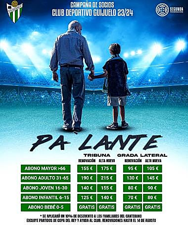 El club chacinero tiene carnés para adulto, mayores, jóvenes, infantiles y bebés, estos últimos gratuitosEl CD Guijuelo ya tiene para la temporada 2023-24 técnico, jugadores renovados y cedidos, grupo de Segunda RFEF y calendario. Y también campaña de socios para intentar que el municipal Luis Ramos tenga una gran asistencia para el nuevo ejercicio deportivo. Bajo el eslogan 'Pa' lante' y con el protagonismo de un canterano y un veterano socio de la entidad, el club chacinero ya tiene precios para los carnés.