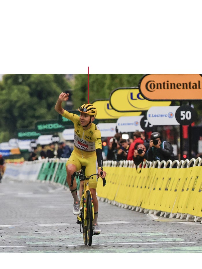 Tadej Pogačar levanta la mano enfundado en el maillot amarillo con el que se ha subido a lo más alto del podio de París cuatro veces a sus 26 años