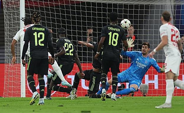 El Real Madrid recibió un correctivo en Alemania que debe servirle como toque de atención de cara a las curvas que se avecinan. La derrota ante el Leipzig, que cercenó la racha de 20 encuentros consecutivos invicto que contabilizaba el equipo de Carlo Ancelotti, provocó la llamada a capítulo de Thibaut Courtois a un conjunto que compareció en el feudo sajón desprovisto de la tensión competitiva exigible en cualquier partido de la Champions, sin que sirvan como excusa para ello el hecho de que saltase al césped del Red Bull Arena con el billete para octavos de final de su torneo fetiche garantizado ni las bajas de piezas esenciales como Modric, Valverde o Benzema.