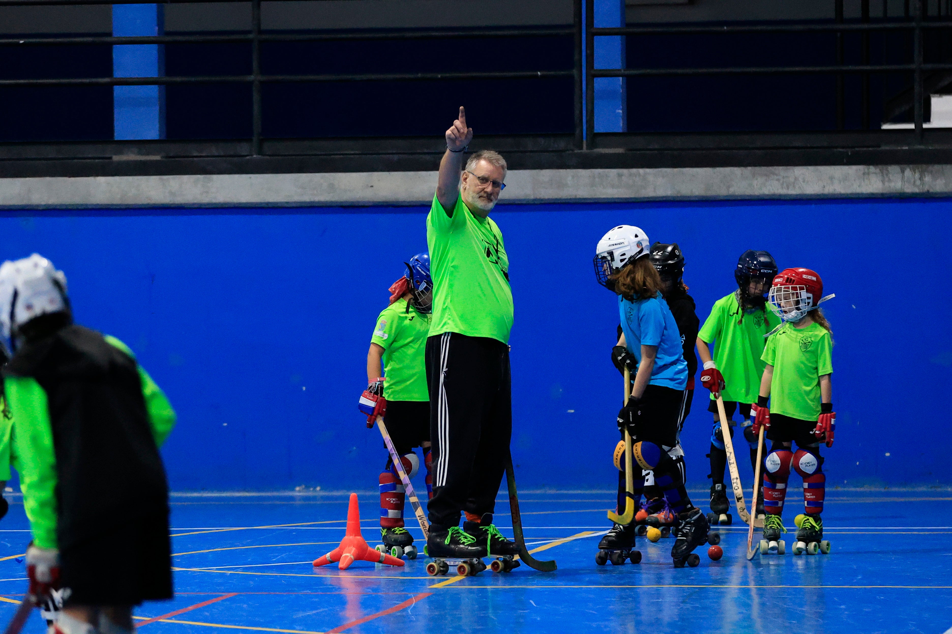 Vamos a un entrenamiento, hablamos con uno de los entrenadores y la presidenta del club, una de las madres; de fondo los niños entrenan y un entrenador profesional, ex jugador de hockey profesional, da una masterclass para un joven portero. Viene de Asturias y ganó una Copa del Rey en el pabellón de La Alamedilla.